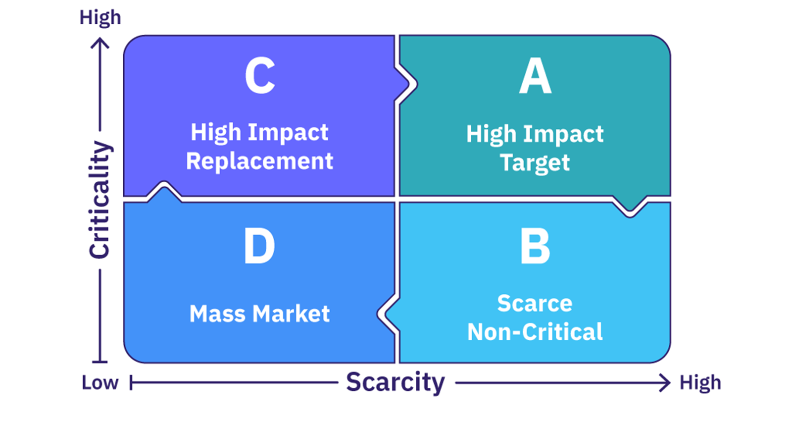 Для этого можно использовать простую матрицу сегментации талантов, которая оценивает навыки с точки зрения критериев критичности и дефицита.