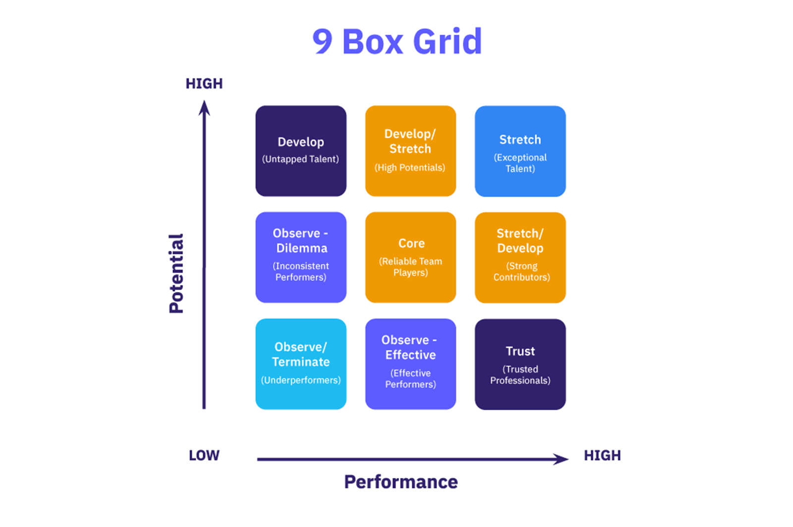 Наиболее известным подходом к распределению талантов является 9 Box grid. Несмотря на свою полезность и практичность, сетка с 9 коробками часто подвергается критике из-за субъективности, связанной с измерением производительности и потенциала – двух осей, которые управляют принятием решений в рамках сетки с 9 коробками.