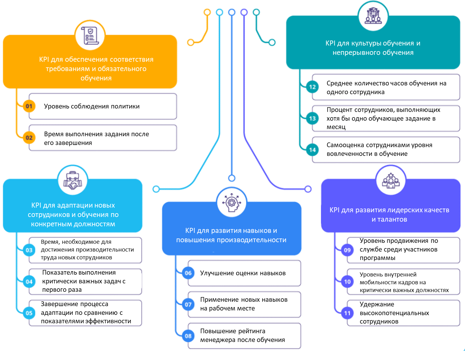 KPI для обучения и развития основываются на этих метриках, связывая учебную активность с результатами. Они отслеживают изменения, такие как развитие навыков, скорость повышения квалификации, повышение качества и продуктивности, удержание ключевых талантов и внутренняя мобильность. Таким образом, метрики предоставляют входные данные, а KPI подтверждают, оказало ли обучение реальное и измеримое воздействие.